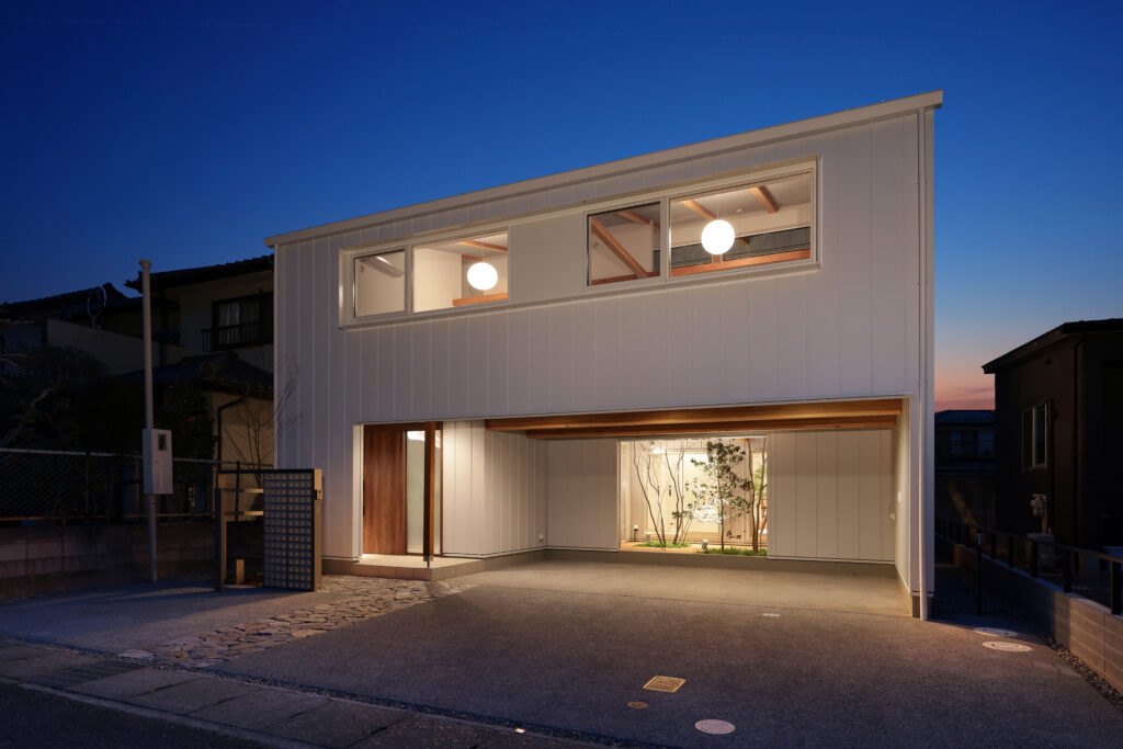 中庭を囲む自然素材のガレージハウス(夜)