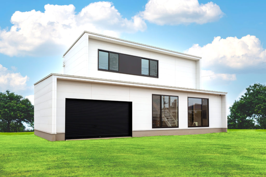 愛車を2台収容できる白亜のガレージハウス。 箱を積み上げたような直線的なフォルムの外観は、開口部を縁取る黒いサッシによって水平ラインが強調され、キリリと引き締まった印象。 ル・コルビュジエが設計したサボア邸の連続窓からインスピレーションを受けている。 白を基調とした無機質な居住空間には、ご主人がコレクションするデザイナーズ家具を配置。 フロアの中心に据えたシャープなスケルトン階段が、間仕切りのない空間をさりげなくゾーニングしている。